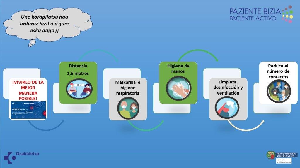 En el caso actual, en el que una pandemia nos tiene afectados de forma general a toda la sociedad, esa determinación para convertirnos en agentes activos del cuidado de nuestra salud debería ser una actitud general y compartida por toda persona y desde aquí y como monitor del programa Paziente Bizia-Paciente Activo, hago un llamamiento a esta responsabilidad personal que debemos ejercer en el cuidado de nuestra salud y de la de aquellos con los que convivimos.
